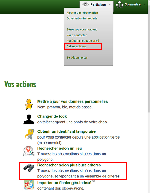 2.68 La recherche multi-critères permet de combiner la recherche par lieu avec une recherche par attributs. Elle est disponible aux rédacteurs et observateurs autorisés, depuis la page personnelle, sous le menu "autres actions" :