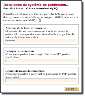 Lors de la première connexion à cette adresse, une procédure d’installation pas-à-pas démarre. L’interface est très simple, il suffit d’entrer les informations demandées (essentiellement les informations concernant la base de données SQL indiquées au début). Une fois que c’est terminé, le système vous demande l’identification que vous avez fournie et vous pouvez commencer à gérer votre site. Par la suite, c’est toujours dans cet espace privé que vous irez travailler, muni de vos codes d’identification.