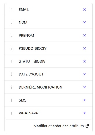 Brevo propose par défaut un jeu d’attributs associés à un contact : nom, prénom, téléphone, etc. Pour les besoins de Sibmail, vous devrez ajouter à cette liste un attribut destiné à accueillir le pseudo sous lequel un observateur est enregistré sur le site Biodiv. En effet, SPIP n’exigeant pas de saisir un nom et un prénom, tout utilisateur peut s’enregistrer sur un pseudonyme ; il peut-être alors intéressant de distinguer le nom réel de l’utilisateur (si c’est un adhérent de votre association par exemple) de son pseudo sous Biodiv. Par convention, nous appellerons cet attribut PSEUDO_BIODIV (vous pouvez choisir une autre dénomination).