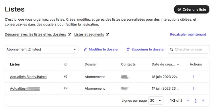 Il est recommandé d’organiser vos listes en dossiers, et, en particulier, de définir un dossier qui contiendra uniquement les listes de distribution auxquelles un visiteur peut souscrire via Sibactu.