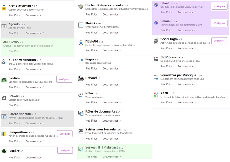 Autrement dit, le seul usage des plugins sur fond blanc suffit à faire fonctionner un site Biodiv. La mention ’Configurer’ sur l’image ci-dessous indique que le plugin doit être configuré pour un bon fonctionnement de Biodiv. Les autres configurations proposées par SPIP sont optionnelles : la configuration par défaut convient.