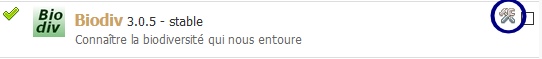 Cette configuration s’effectue depuis l’espace privé : menu "Configuration > Gestion des plugins > Plugins actifs." Pour accéder au formulaire de configuration, sélectionnez les outils dessinés sur la droite de l’entrée du plugin Biodiv :