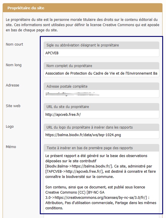 Le propriétaire du site est la structure qui encadre l’activité, typiquement une association. Les informations fournies ici sont utilisées par les fonctions de génération de rapports. On se rapportera au chapitre correspondant pour plus d’explications sur la manière de renseigner les champs Logo et Memo.