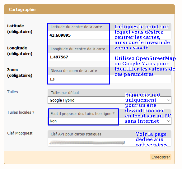 Le premier formulaire concerne la gestion de la cartographie. Les coordonnées de centrage de la carte peuvent être obtenues par exemple en consultant Google Maps.