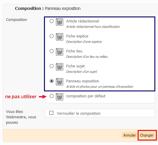 Choisir la composition d’un article est obligatoire : à défaut le contenu de l’article ne serait pas affiché sur le site. Le choix de la composition est accessible depuis l’espace privé, en éditant l’article concerné.