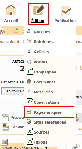 Le plugin Pages de SPIP permet de définir des articles qui n’apparaissent dans aucune rubrique. Ces pages peuvent être modifiées depuis le menu Edition > Pages uniques de l’espace privé.