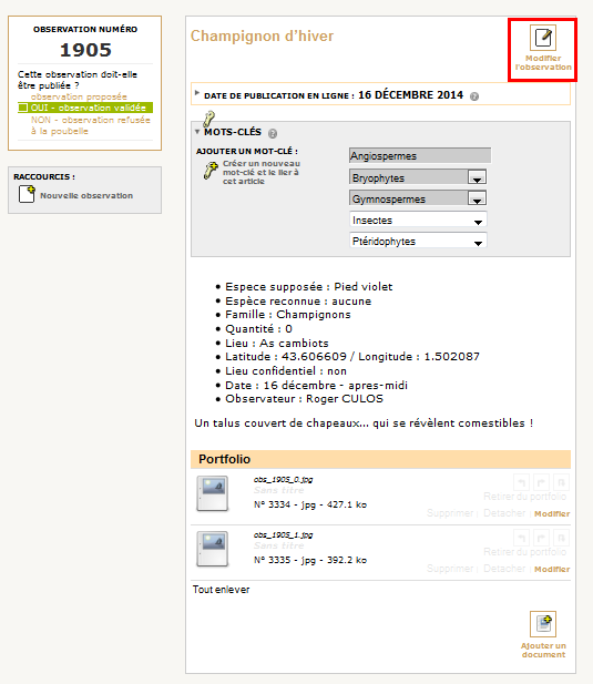 Il est également possible de modifier cette observation, en cliquant sur le bouton en haut à droite.