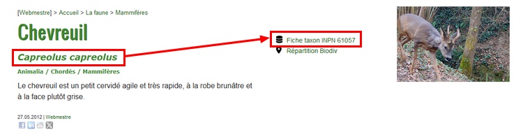 Sur le site Biodiv, un processus d’arrière plan extrait les noms latins des fiches espèces et les compare au champ correspondant le référentiel TAXREF. Si une correspondance est détectée, une entrée est créée ou mise à jour dans la base de données du site. Grâce à cette information, chaque fiche espèce ainsi indexée verra apparaître le numéro de taxon et un lien vers le site de l’INPN.
