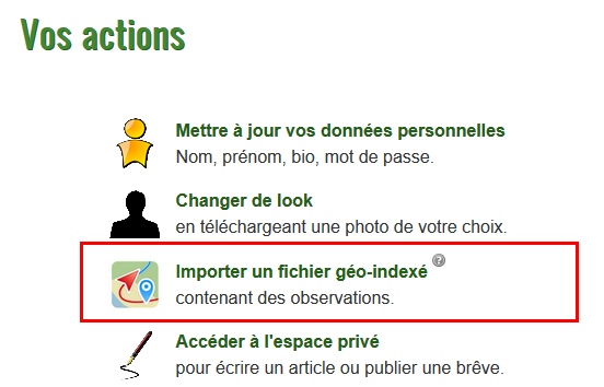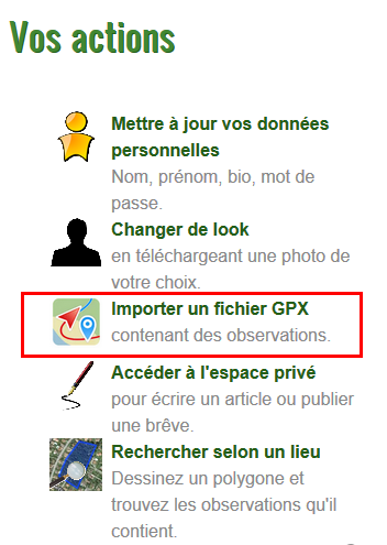 Les rédacteurs peuvent importer les fichiers GPX ainsi constitués pour créer automatiquement les observations dans la base. Pour cela, depuis leur espace personnel, il suffit de choisir l’option Importer un fichier GPX et de charger ensuite le fichier correspondant.