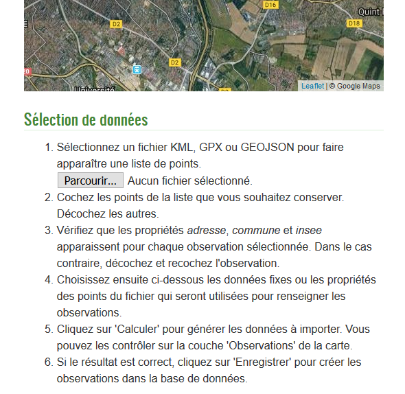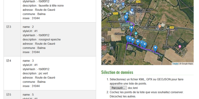 La lecture du fichier conduit à l’affichage des points sur la carte, et dans une liste. Chaque entrée ne correspondant pas à une observation doit alors être décochée.