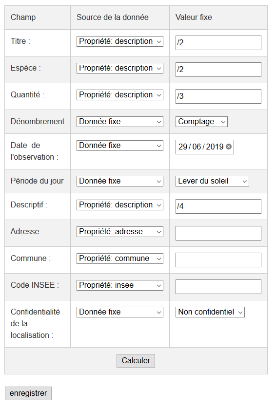 Une fois tout le tableau renseigné, l’utilisateur clique sur Calculer pour préparer les observations. On peut alors les vérifier via la couche "Observations" de la carte. il ne reste plus qu’à cliquer sur Enregistrer pour qu’elles soient enregistrées dans la base.