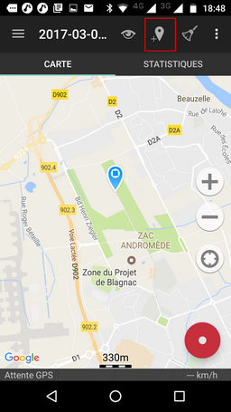 Au début de la sortie, activer le GPS, lancez l’application et débutez l’enregistrement du parcours en appuyant sur le gros bouton rouge de l’écran. L’application enregistre alors votre parcours jusqu’à ce que vous appuyez sur le bouton pause ou stop, ce que vous ferez à la fin du parcours.