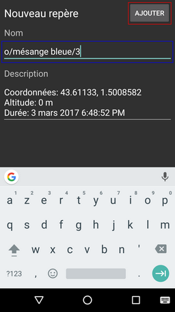 Nous allons ainsi saisir par exemple o/mésange bleue/3 pour indiquer que nous avons observé 3 mésanges bleues. En créant un tel marqueur, l’application ajoute la date, l’heure et la position géographique.