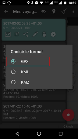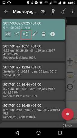 En fin de sortie, cliquez sur le bouton stop sur l’écran. Vous pouvez alors consulter vos trajets. Le plus récent s’affiche en tête de liste. Il vous reste à l’exporter au format GPX en cliquant sur l’icône partage et en choisissant ce format.