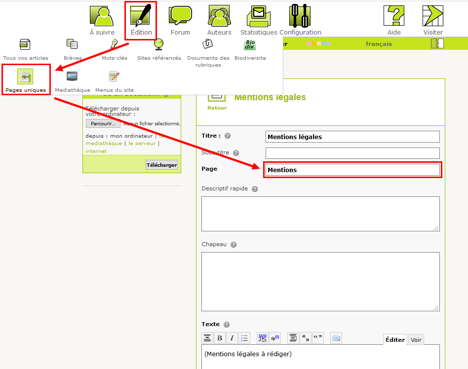 Depuis la version 2.50, une page unique Mentions est dédiée à la description des mentions légales du site.