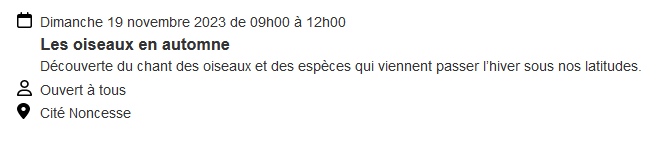 Biodiv fournit trois modèles utilisables avec l’agenda. Ces modèles s’utilisent en insérant une balise dans le contenu rédactionnel d’un article.