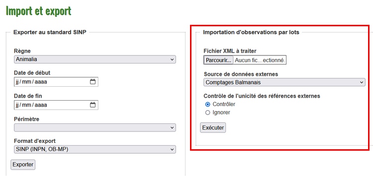 Une fois la source externe créée dans la base, il est possible d’importer le fichier au moyen d’un formulaire situé sur la page Traitements par lots.