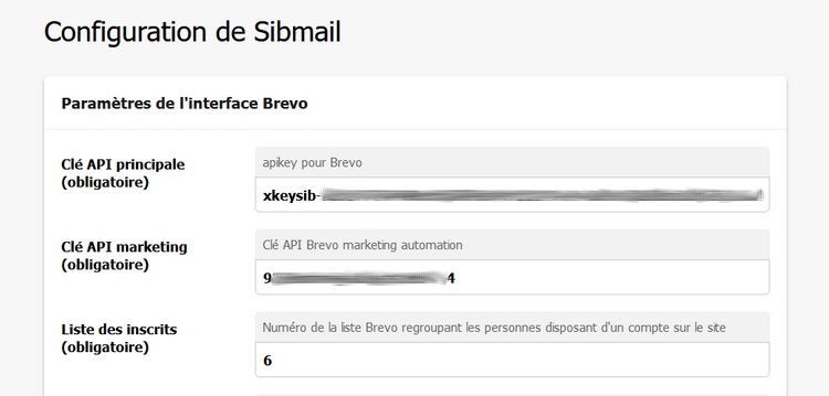 Une fois la configuration de Brevo effectuée, celle de Sibmail se déroule depuis le menu de configuration des plugins dans l’espace privé.
