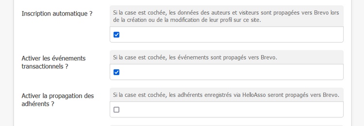 - la propagation des adhérents concerne la liaison entre HelloAsso et Brevo : le site Biodiv ne sert ici que d’intermédiaire pour relayer les événements entre les deux plateformes.