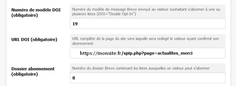 Enfin, vous devez indiquer le numéro du dossier Brevo dans lequel vous avez placé les listes de diffusion auxquelles un visiteur peut s’abonner. Le fait de dédier dans Brevo un dossier à ces listes permet à Sibactu de ne proposer que ces listes au visiteur.