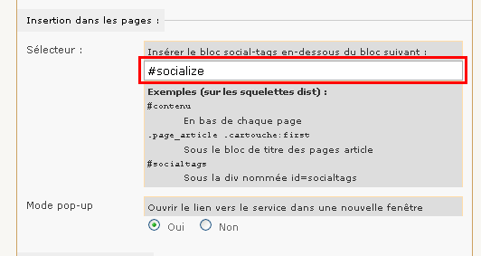 Cette seconde fonction nécessite l’activation et le paramétrage du plugin "Social-tags", documenté sur Spip-contrib . Le plugin vous permet de choisir vos réseaux sociaux. Mais pour que leurs icones apparaissent correctement sur les pages de Biodiv, vous devez préciser un élément de configuration du plugin :