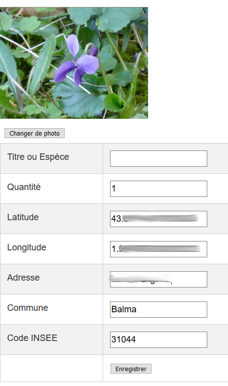 La photo prise, une nouvelle page apparait qui pré-renseigne votre position GPS et votre adresse. Il ne vous reste qu’à saisir le titre et la quantité de l’observation. Enregistrez et l’observation est créée !
